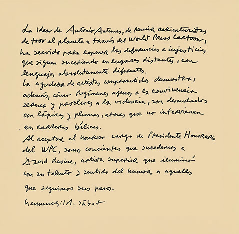 We were honored to carry the privilege of having him as Honorary President between 2010 and 2018, when he left us, continuing to work to make World Press Cartoon the global hall where authors from all continents, all cultures and all sensibilities can compete for awards that distinguish talent, creativity and the courage to show us, with a smile, the facts and protagonists who bring newspapers around the world to life every day.